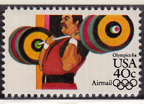 Zu den Olympischen Spielen 1984 in Los Angeles erschien in den USA auch eine Marke mit einem Gewichtheber bei einem Versuch im Stoßen im Markenbild (MiNr 1625). Die Marke gibt es in zwei verschiedenen Zähnungen: A = gez. K 11 (8.4.1983) und F = gez. L 10 3/4 (1984)