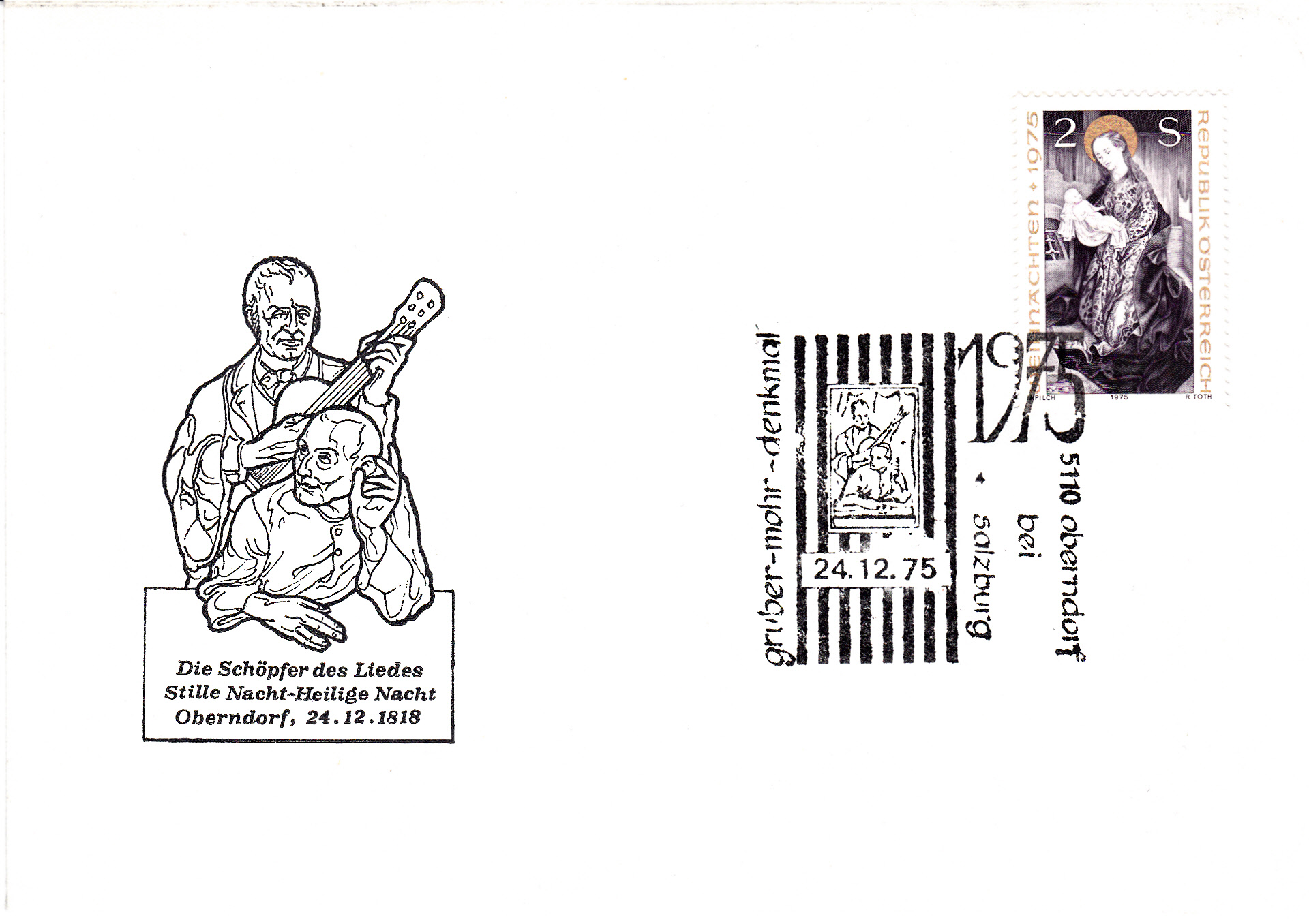 Im Sonderstempel aus Oberndorf vom 24.12.1975 wird dieses Mohr-Gruber-Denkmal im Stempelbild gezeigt. Der Stempel hat die Kennziffer "4".