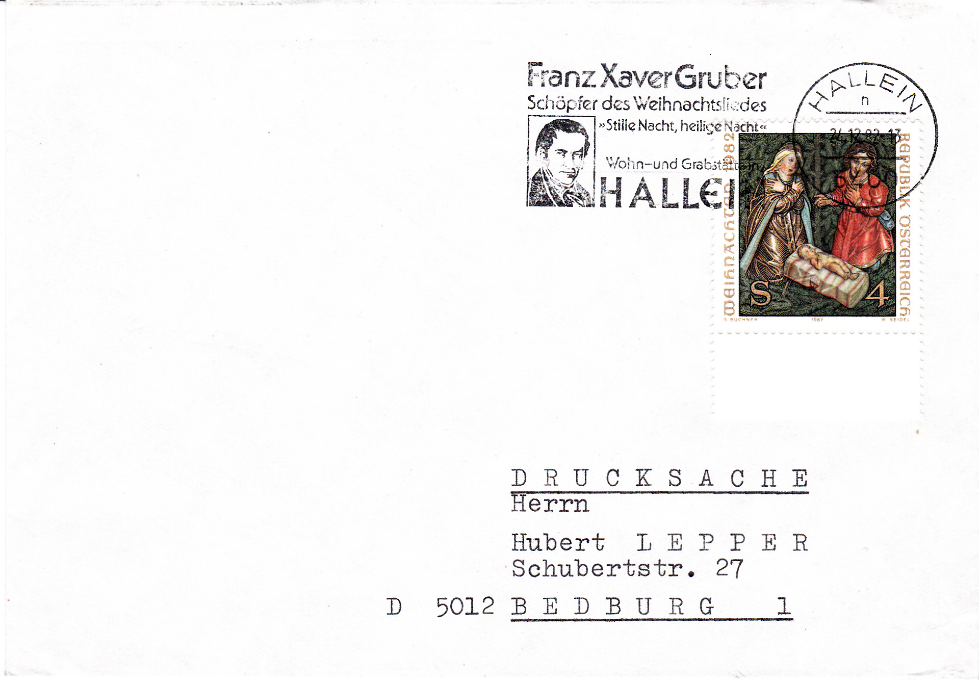 Maschinenwerbestempel aus Lamprechtshausen vom 24.12.1982 mit dem Werbeeinsatz "ARNSDORF Geburtsstätte der Melodie Stille Nacht, Heilige Nacht". Franz Xaver Gruber, der Komponist dieses Liedes, war Lehrer in Arnsdorf.