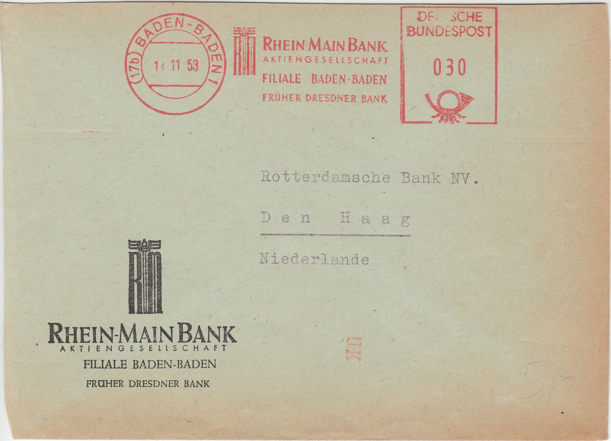 Dieser nach Den Haag adressierte, am 14.11.1953 in Baden-Baden aufgebene Brief durchlief in Den Haag die Eingangssortierung per TRANSORMA, worauf ein Operatorstempel "UK" hinweist: