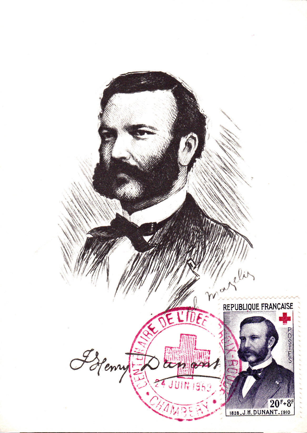 Auf einer der beiden Zuschlagsmarken "Rotes Kreuz" des Jahres 1958 ist in Frankreich auch eine Marke (MiNr 1225) erschienen. Hier ein Exemplar auf einer Maximumkarte mit einem Sonderstempel aus Chambery vom 24.6.1959 "100 Jahre Idee des Roten Kreuzes". Der Stempel weist auf die Erfahrung Henri Dunants bei der Schlacht im Juni 1859 in der Nähe der italienischen Stadt Solferino hin.