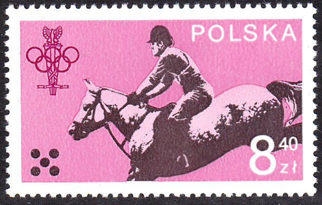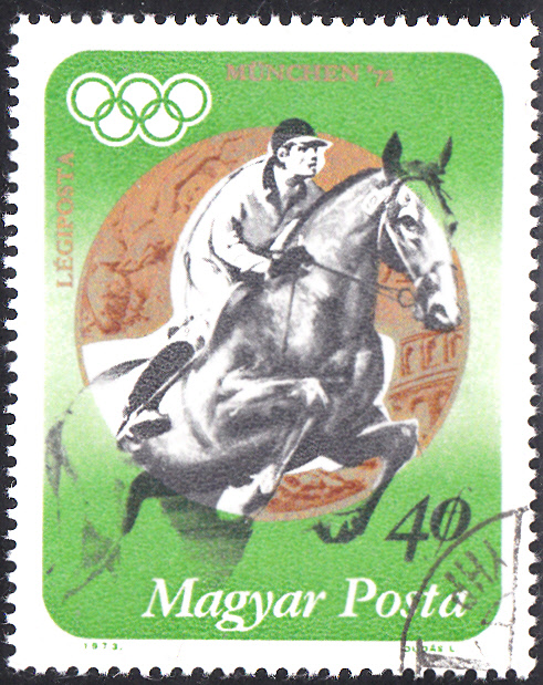 Diese Marke aus Ungarn (MiNr 3437 A) zeigt einen Springreiter bei einer Disziplin beim Modernen Fünfkampf, wie man am Emblem unten über "POSTA" erkennt, das für den Modernen Fünfkampf benutzt wird.