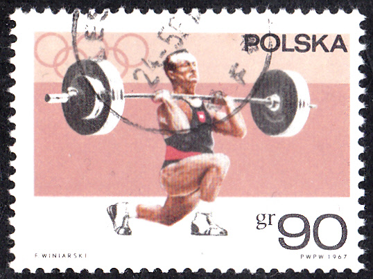 Diese Marke aus Polen (MiNr 1764) bildet einen Gewichtheber ab.