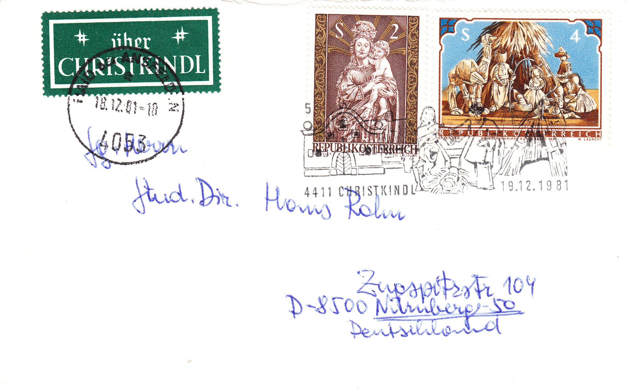 Ohne den Klebezettel mußte die Post direkt in Christkindl aufgegeben werden, wobei auch dieser nach Deutschland adressierte Beleg am 10.12.1981 den Sonderstempel mit der Kennziffer "5" erhielt: