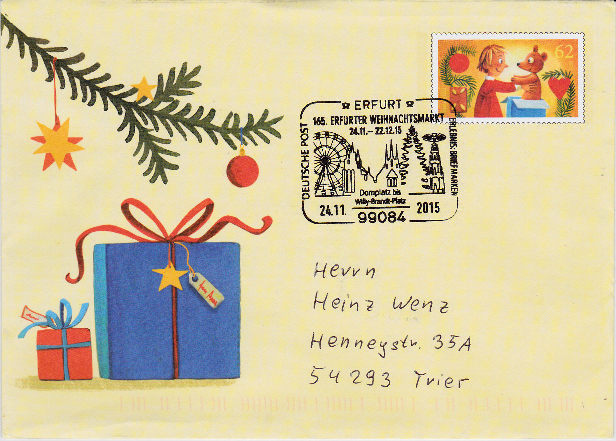 Nachdem hier in einem der vorigen Beiträge bereits der Sonderstempel aus Erfurt zum Nikolaustag auf dem Erfurter Weihnachtsmarkt gezeigt wurde folgt huer ein zweioter Sonderstempel zum Erfurter Weihnachtsmarkt 2015 vom Eröffnungstag dem 24.11.2015.