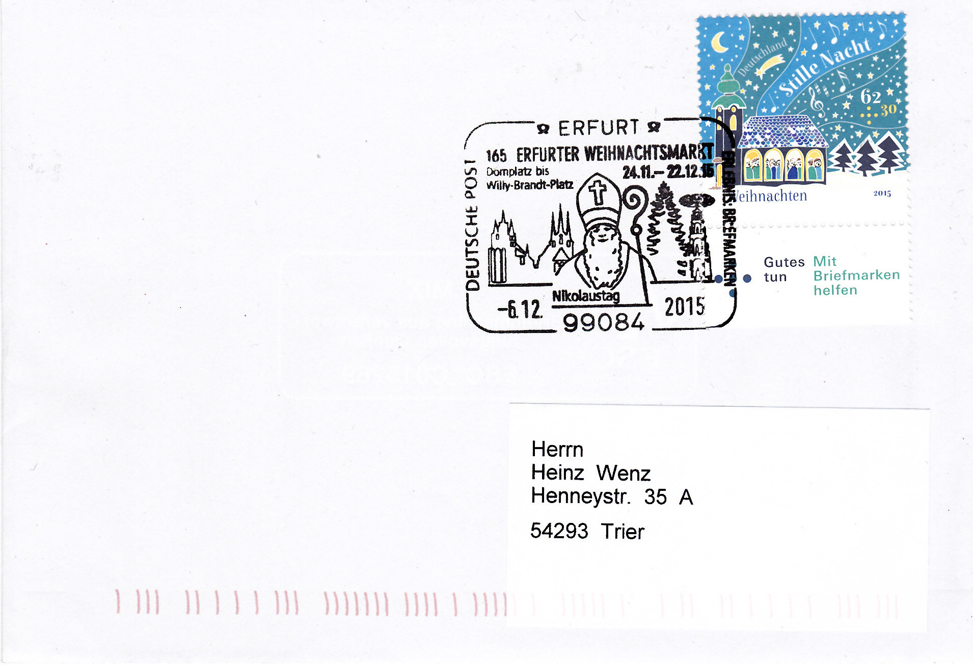 Nachdem hier in einem der vorigen Beiträge bereits der Sonderstempel aus Erfurt zum Nikolaustag auf dem Erfurter Weihnachtsmarkt gezeigt wurde folgt huer ein zweioter Sonderstempel zum Erfurter Weihnachtsmarkt 2015 vom Eröffnungstag dem 24.11.2015.