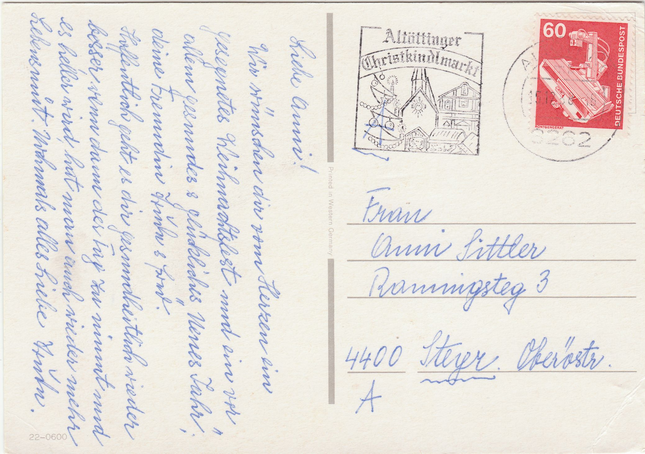 Der Werbeeinsatz dieses Maschinenstempels ruft auch Euch auf zum Besuch des ALTÖTTINGER CHRISTKINDLMARKT: