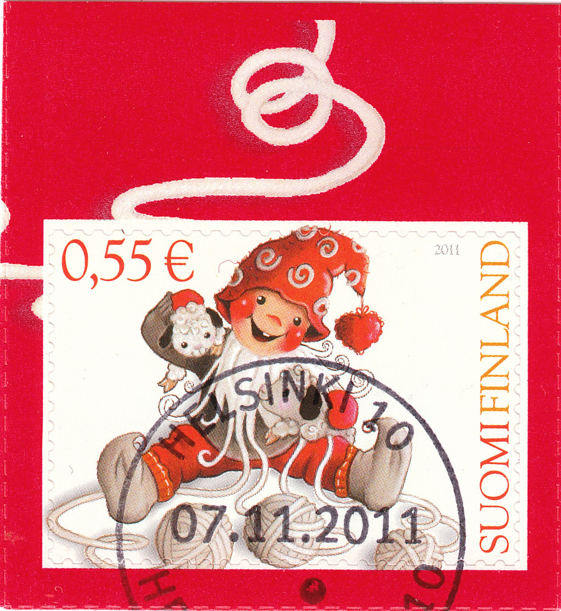 Hier ein finnischer Weihnachtswichtel mit einem Schäfchen und drei Wollknäueln: