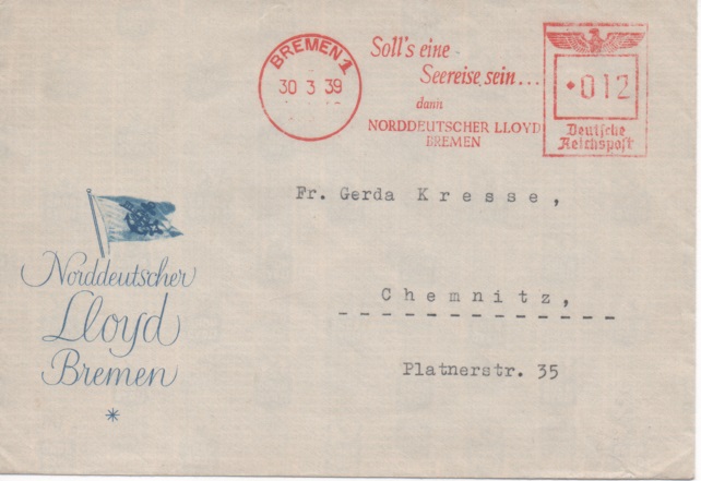 Im März 1939 warb der NDL mit folgendem Absenderfreistempel für Kreuzfahrten an Bord seiner Schiffe: