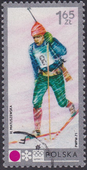 In Polen erschien in der Serie zu den Olympischen Spielen 1972 in Sapporo diese Marke (MiNr 2145) mit einem Biathleten in der Loipe.