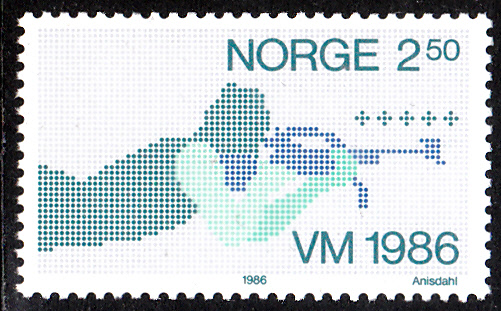 Zu den Biathlon-Weltmeisterschaften 1986 in Oslo ist diese Marke in Norwegen (MiNr 940) mit einem Biathleten beim Liegend-Schießen erschienen.