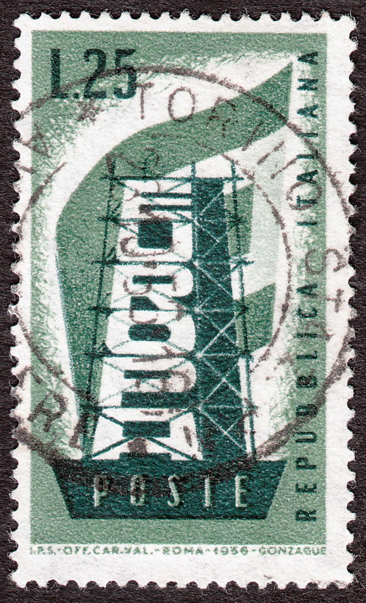 Hier ein gestempeltes Exemplar der Europamarke 1956 aus Italien der Wertstufe zu 25 Lire, katalogisiert als MiNr. 973: