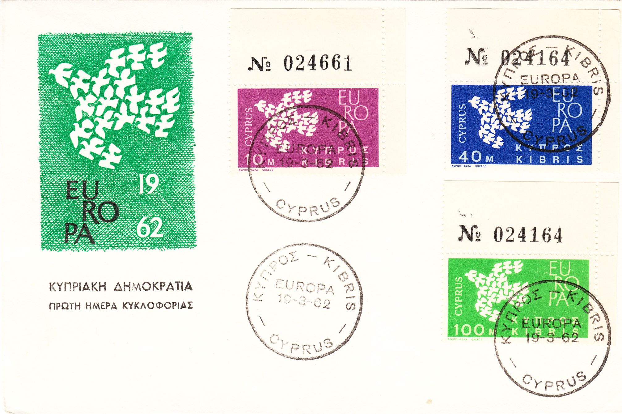 In Zypern erschienen die Europamarken 1961 erst am 19. März 1962. Hier die Marke zu 100 Mills grün mit dem Gemeinschaftsmotiv "Stilisierte Taube aus 19 Einzeltauben", die in einer Auflage von 965 459 Stück erschien.