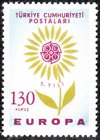 In der Türkei erschienen die Europamarken 1964 am 14. September 1964. Hier die Marke zu 130 Kurus mit dem Gemeinschaftsmotiv "Stilisierte Blume mit 22 Blütenblättern um CEPT-Emblem", die in einer Auflage von 700 000 Stück erschien.