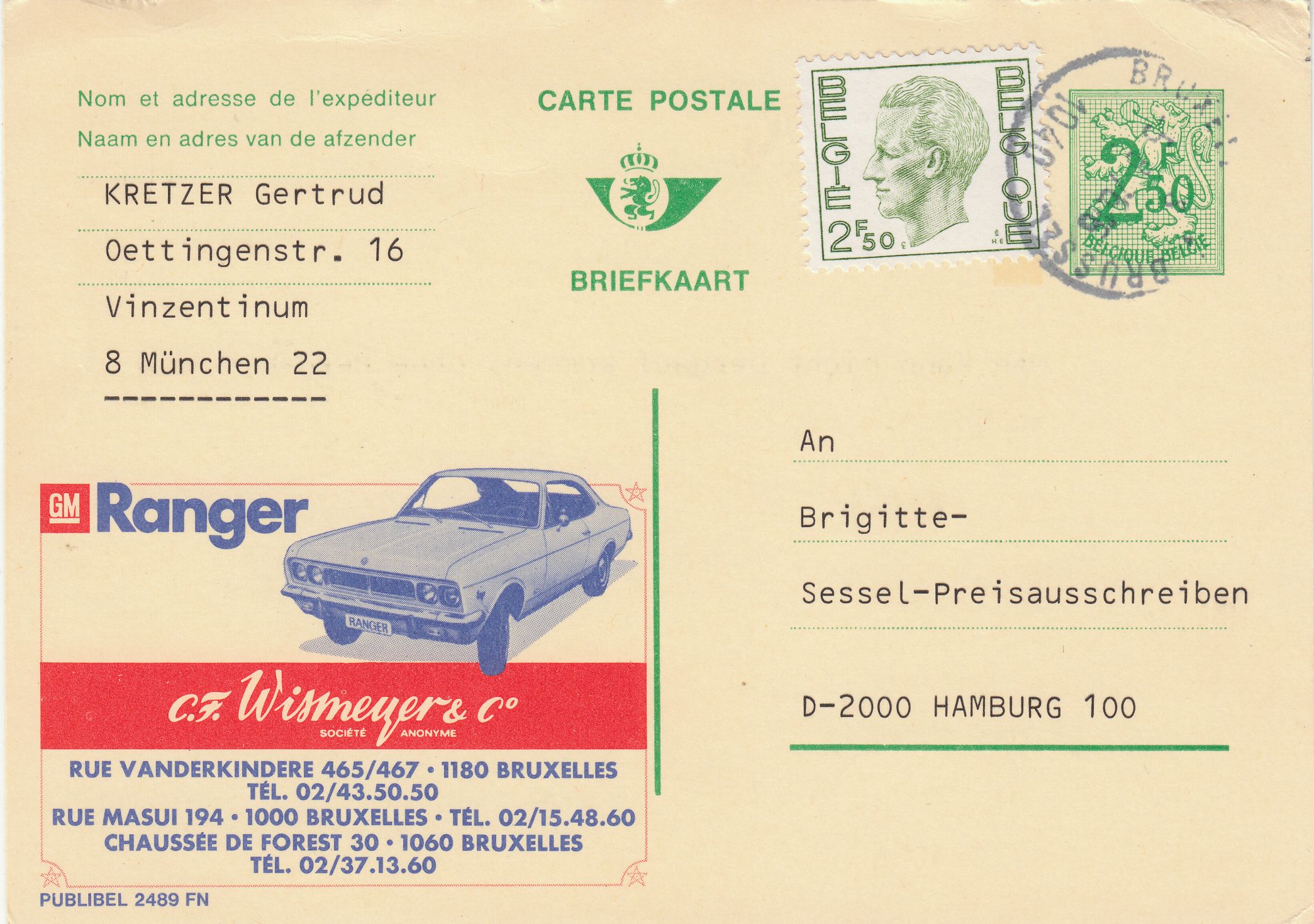 Hier eine belgische Ganzsache "Publibel 2489 FN" mit einer Werbung für ein Automobil "GM Ranger":