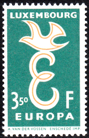 In Luxemburg erschienen die Europamarken 1958 am 13. September 1958. Hier die Marke zu 3.50 Fr blaugrün/gelborange mit dem Gemeinschaftsmotiv "Stilisierte Taube über Buchstabe „E“" , die in einer Auflage von 765 000 Stück erschienen ist.