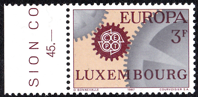 In Luxemburg erschienen die Europamarken 1967 am 2. Mai 1967. Hier die Marke zu 3 Fr mit dem Gemeinschaftsmotiv "Ineinandergreifende Zahnräder, Antriebsrad mit CEPT-Emblem", die in einer Auflage von 1 050 000 Stück erschien.