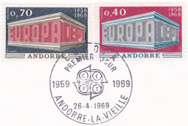 Bei der französischen Post in Andorra erschienen die Europamarken 1969 am 27. April 1969. Hier eine Marke zu 0.40 Fr mit dem Gemeinschaftsmotiv "„EUROPA“ und „CEPT“ in Tempelform", die in einer Auflage von 690 000 Stück erschien.