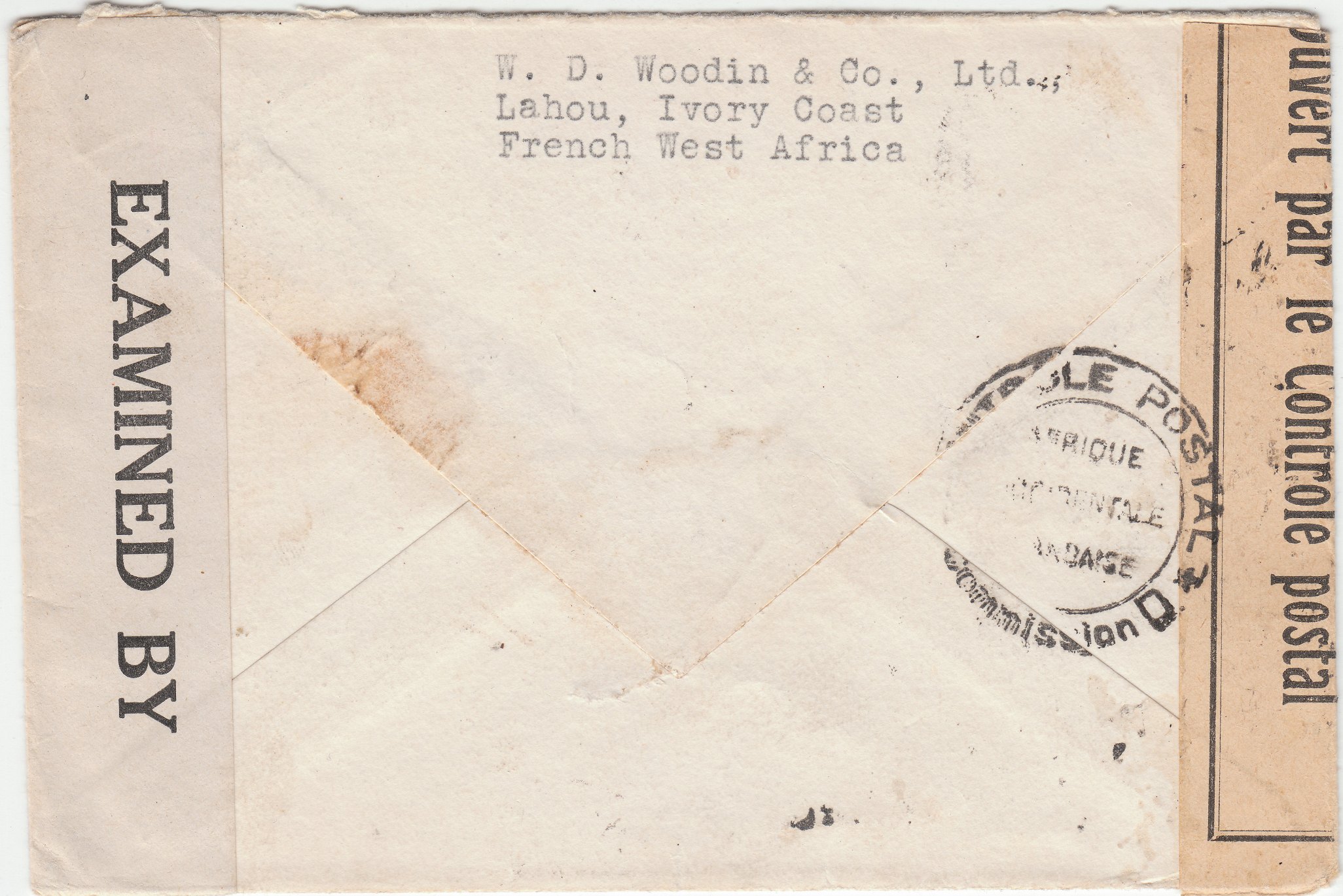 In der zu Französisch-Westafrika gehörenden Elfenbeinküste erfolgte die Dokumentation der durchgeführten Zensurierung, wie bei diesem in Lahou, Elfenbeinküste, aufgegebenen Beleg, mit diesem Doppelkreisstempel 34/24 mm "CONTROLE POSTAL Commission D AFRIQUE OCCIDENTALE FRANCAISE":