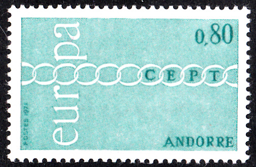 Bei der französischen Post in Andorra erschienen die Europamarken 1971 am 8. Mai 1971. Hier die Marke zu 0.50 Fr blaugrün mit dem Gemeinschaftsmotiv "Brüderlichkeit und Zusammenarbeit durch Kette symbolisiert", die in einer Auflage von 925 000 Stück erschien.
