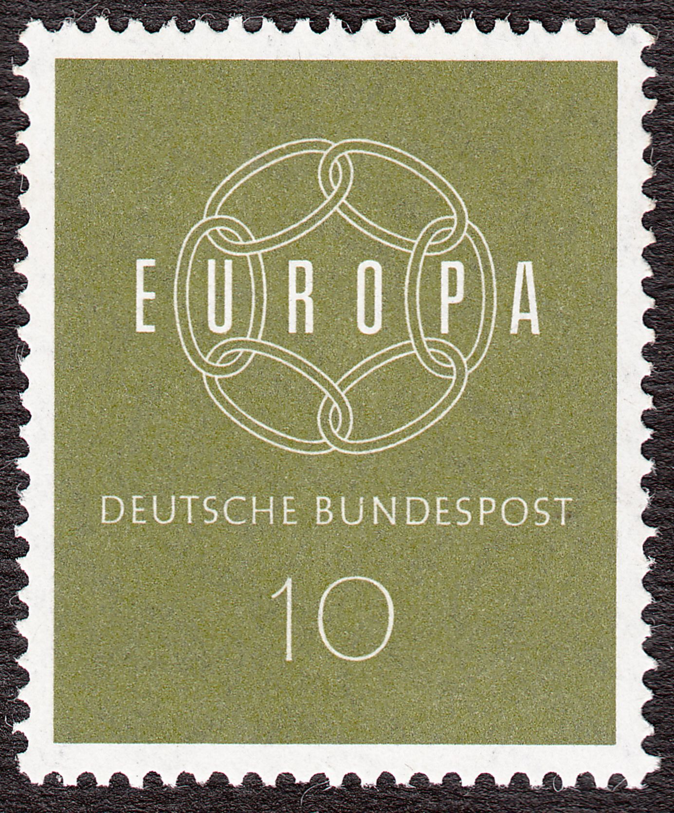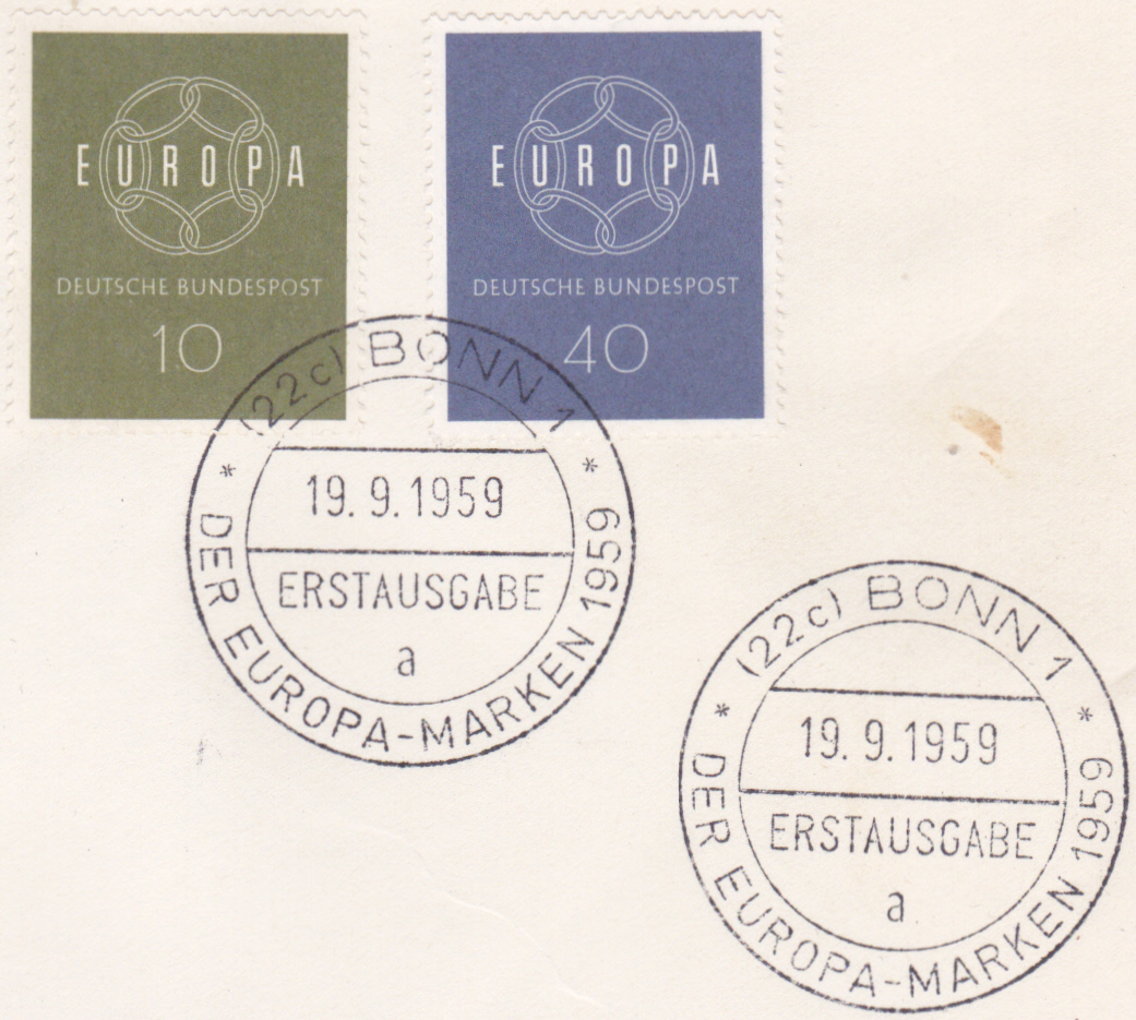 Am 19.09.1959 erschien die in einer Auflage von 90 Millionen Stück im Offsetdruck hergestellte Wertstufe zu 10 Pfennig der Europamarke 1959: