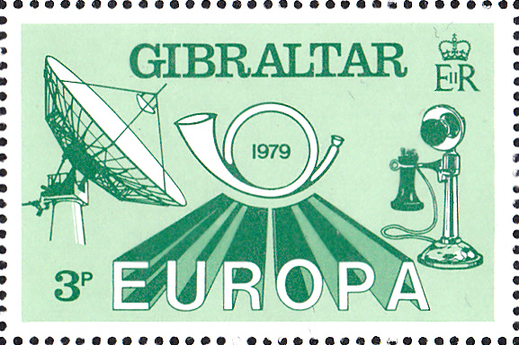 In Gibraltar erschienen 1979 erstmals drei Europamarken zum Gemeinschaftsthema "Geschichte des Post- und Fernmeldewesens" am 16. Mai 1979. Alle drei Marken haben das gleiche Motiv: Antenne einer Erdfunkstelle, Posthorn, Fernsprecher. Hier die Marke zu 3 P matt-/smaragdgrün.