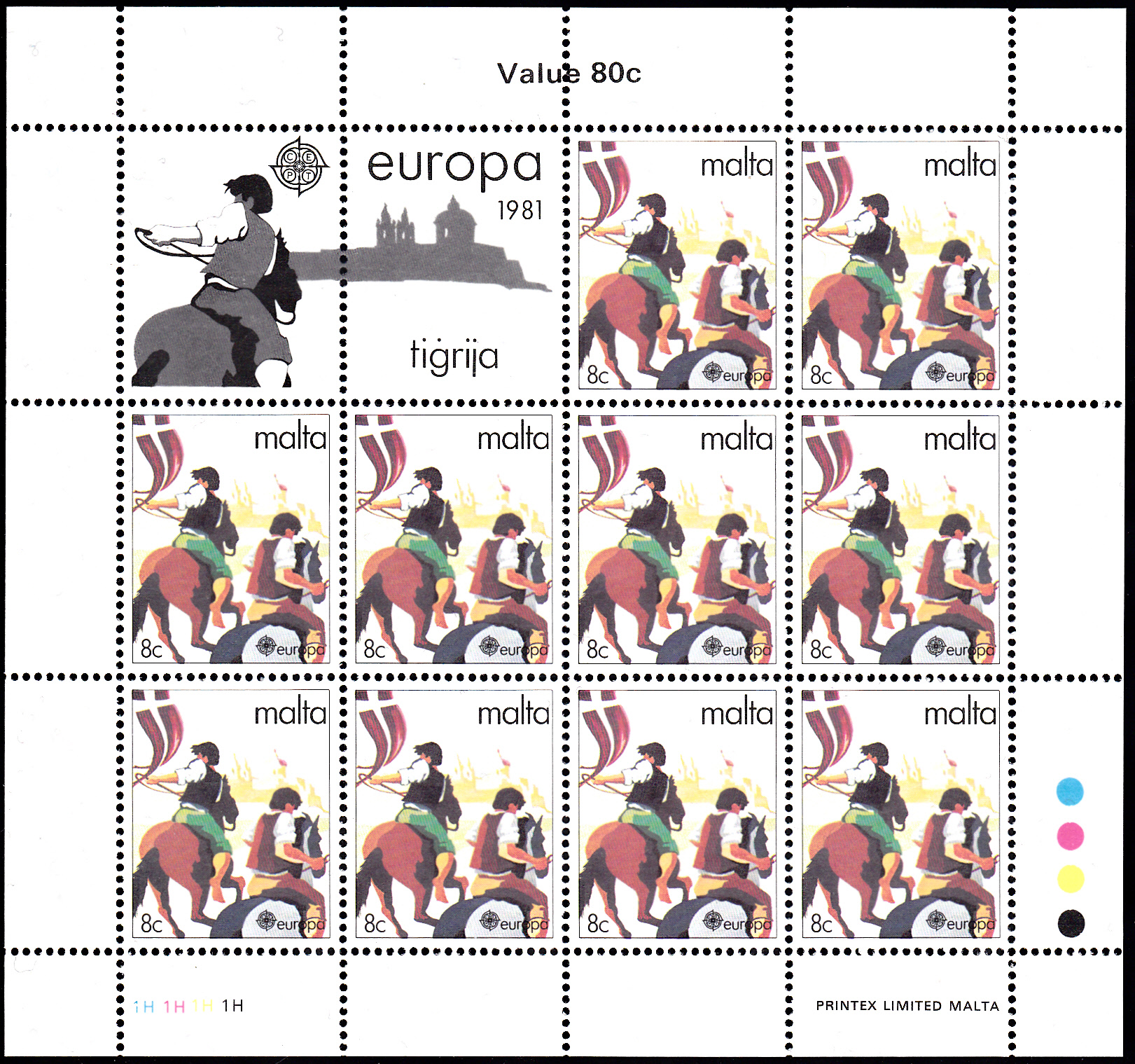 Auf Malta erschienen die Europamarken 1981 zum Gemeinschaftsthema "Folklore" am 28. April 1981. Hier ein Eckrandstück mit Druckvermerk der Marke zu 8 c mit dem Motiv "Tigrija" (Traditionelles Pferderennen).
