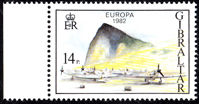 In Gibraltar erschienen die Europamarken 1982 am 11. Juni 1982 zum Gemeinschaftsthema "Historische Ereignisse" mit Abbildungen zum Thema "Operation Torch (1943)". Operation Torch (englisch für Operation Fackel) war der Deckname der britisch-amerikanischen Invasion Französisch-Nordafrikas während des Zweiten Weltkrieges. Hier die Marke zu 14 P mit dem Flugplatz von Gibraltar mit Militärflugzeugen.