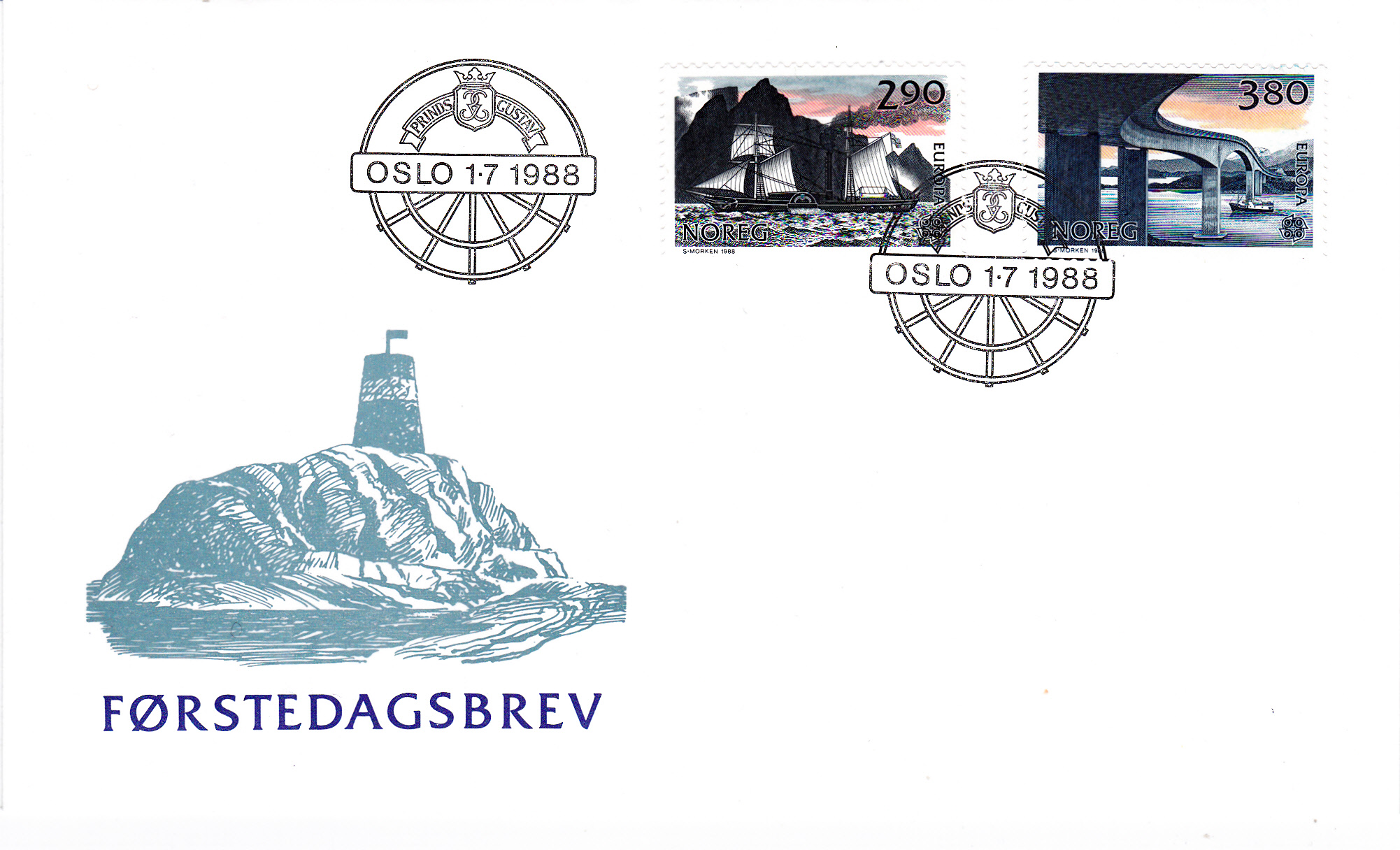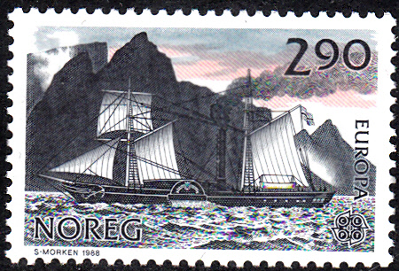 In Norwegen erschienen die Europamarken 1988 zum Gemeinschaftsthema "Transport- und Kommunikationsmittel" am 1. Juli 1988. Hier die Marke zu 2,90 Kronen mit der Abbildung des Raddampfers "Prinds Gustav" (um 1838) vor den Lofoten-Insel, die in einer Auflage von 11 412 409 Stück erschien.