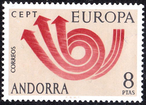 Bei der spanischen Post in Andorra erschienen die Europamarken 1973 am 30. April 1973. Hier die Marke zu 8 Pesetas, die im Gemeinschaftsmotiv "Stilisiertes Posthorn" erschien. Die Auflage betrug 750 000 Stück.
