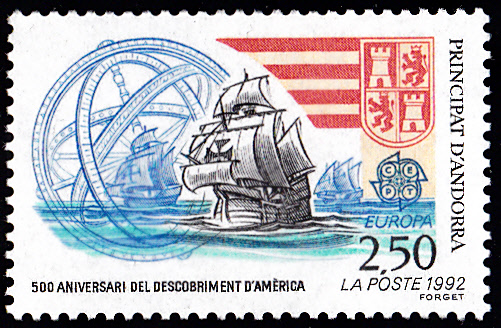 Die Europamarken 1992 der französischen Post in Andorra zum Gemeinschaftsthema "500. Jahrestag der Entdeckung von Amerika" sind am 25. April 1992 erschienen. Hier die Marke zu 2,50 Franc mit der Abbildung der Karracke „Santa Maria“, den Karavellen „Niña“ und „Pinta“ und einem nautisches Instrument. Die Auflage der Marke betrug 473 844 Stück.