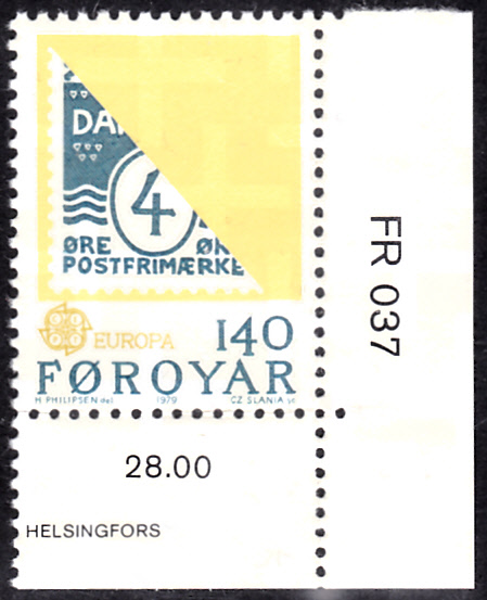 Auf den Färöer-Inseln erschienen die Europamarken 1979 zum Gemeinschaftsthema "Geschichte des Post- und Fernmeldewesens" am 7. Mai 1979. Hier die Marke zu 140 Öre mit der Abbildung der Marke Dänemark MiNr. 80 H . Die Auflage betrug 2 000 000 Stück.