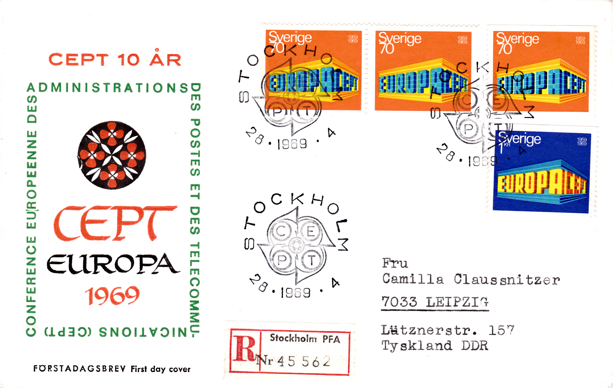 In Schweden erschienen die Europamarken 1969 am 28. April 1969. Hier eine Marke zu 1 Krone senkrecht gezähnt mit dem Gemeinschaftsmotiv "„EUROPA“ und „CEPT“ in Tempelform", die in einer Auflage von 7 871 000 Stück erschien. Diesen Wert gibt es nur aus Rollen.