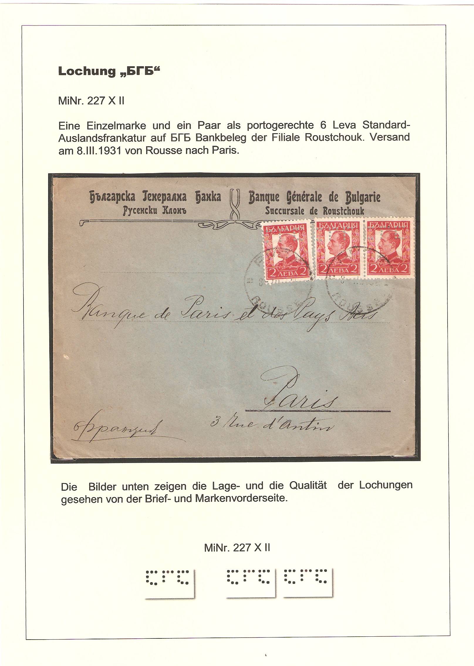 Es gab zu der Zeit, 1923-1924, einen massiven Mangel an Freimarken in Bulgarien und es wurde den Schalterbeamten erlaubt auch Portomarken zur Frankatur zu verwenden. Demzufolge konnten auch die Banken und Firmen nur Portomarken erwerben um diese mit ihren Lochungen zu versehen. Das Korrespondenzaufkommen der Banken und Firmen war- und ist natürlich wesentlich geringer als die sämtlicher Privatpersonen, deshalb die relative Seltenheit der gelochten Marken auf Belegen.