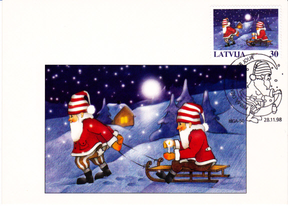 Weihnachtsmarke 1998 aus Lettland mit Abbildung zweier Weihnachtsmänner auf Maximumkarte der lettischen Post am Ersttag (28.11.1998) in Riga-50 mit dem Ersttagssonderstempel abgestempelt.
