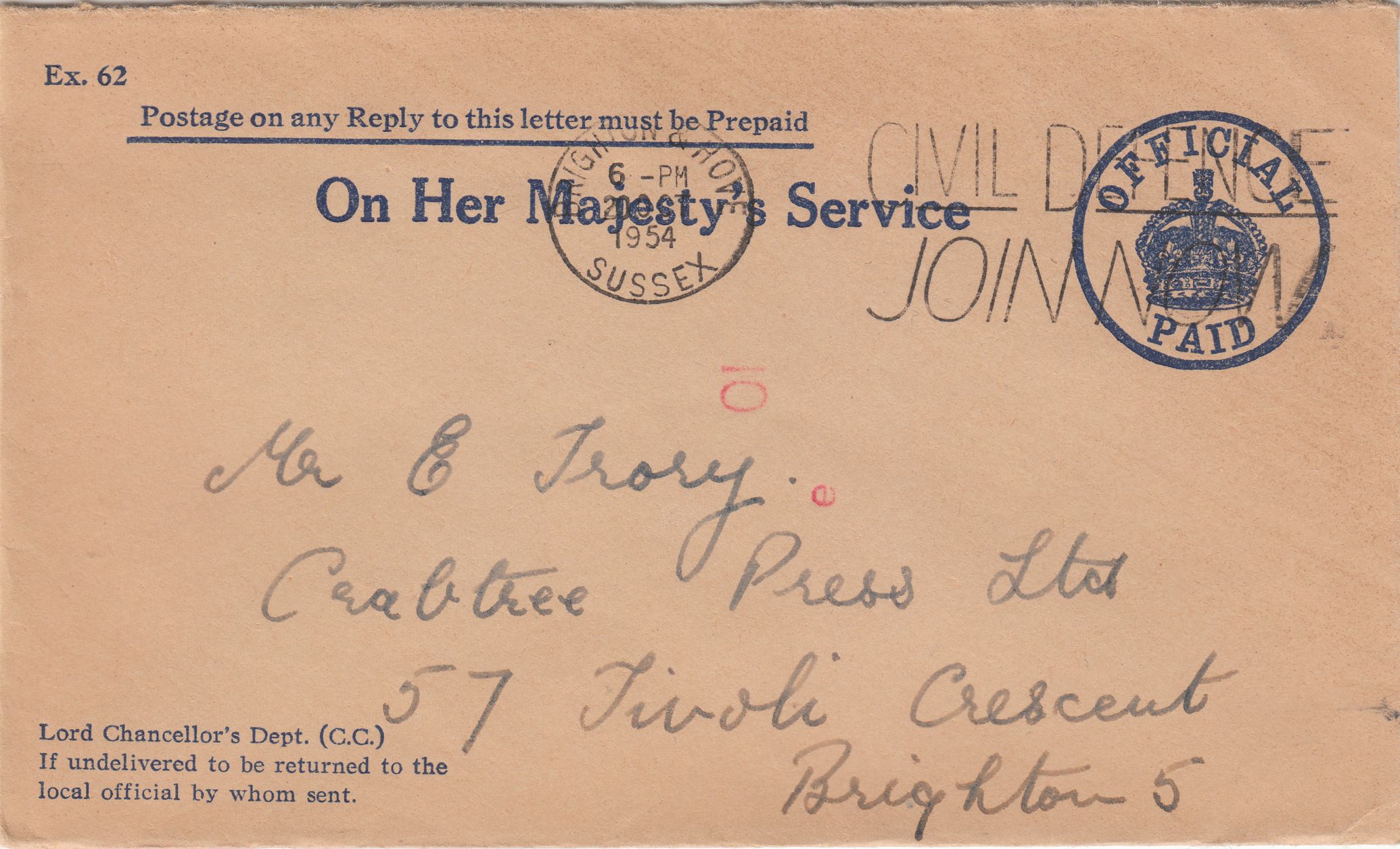 Hier ein Beleg, der als portofreie Dienstsache im Ortsverkehr von Brighton lief und zwei verschiedene Operatorstempel erhielt, eine "10" sowie ein "e":