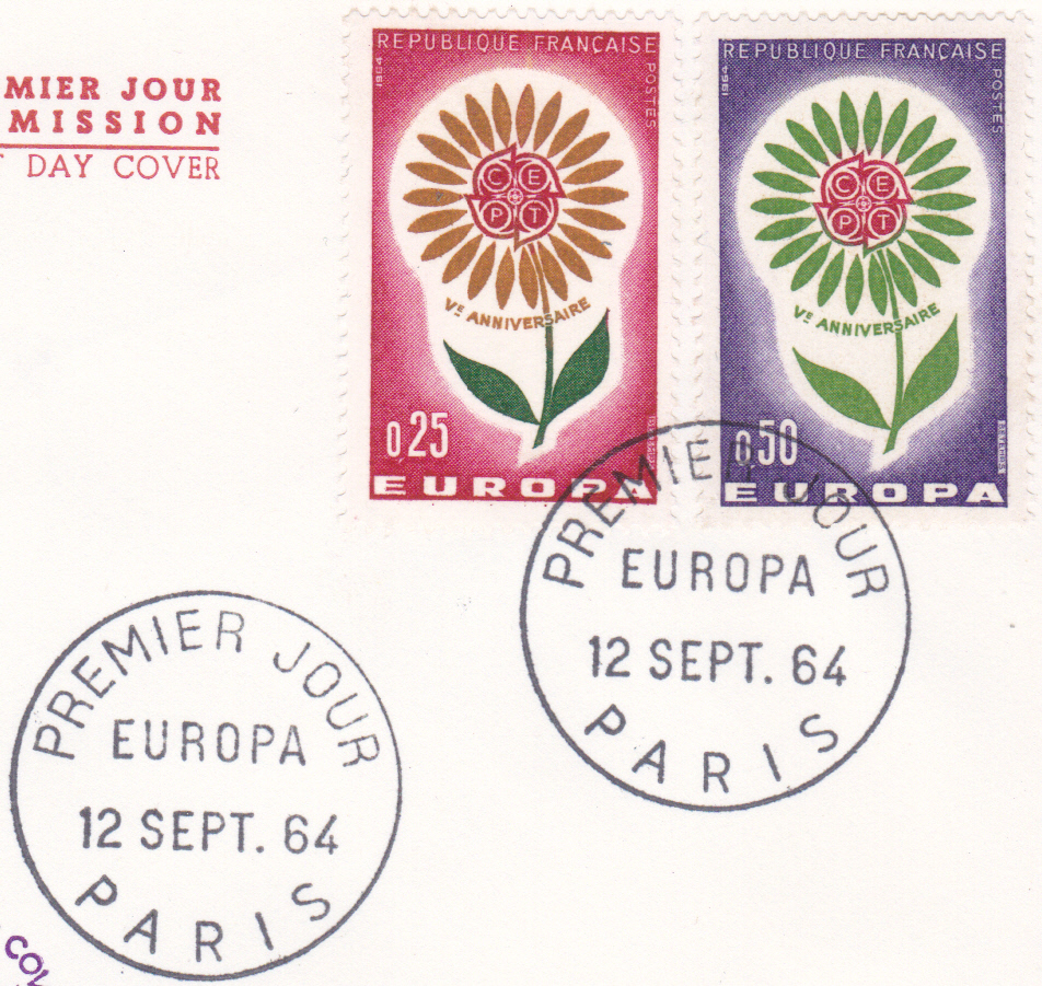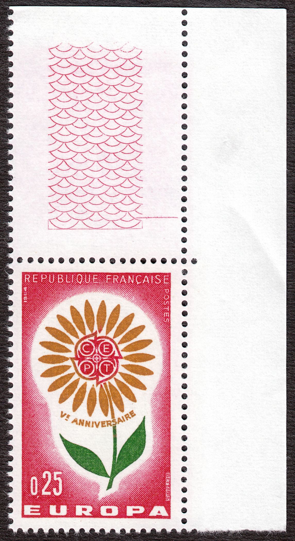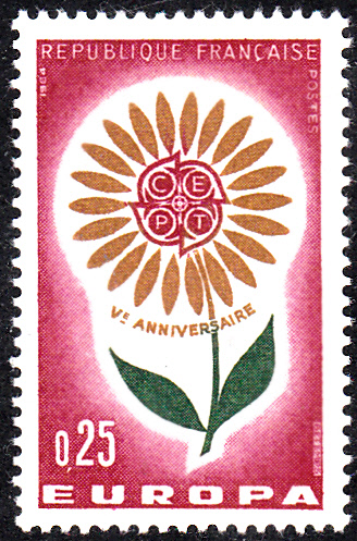In Frankreich erschienen die Europamarken 1964 am 12. Sept. 1964. Hier die Marke zu 0,25 Francs mit dem Gemeinschaftsmotiv "Stilisierte Blume mit 22 Blütenblättern um CEPT-Emblem", die in einer Auflage von 28 990 000 Stück erschien.