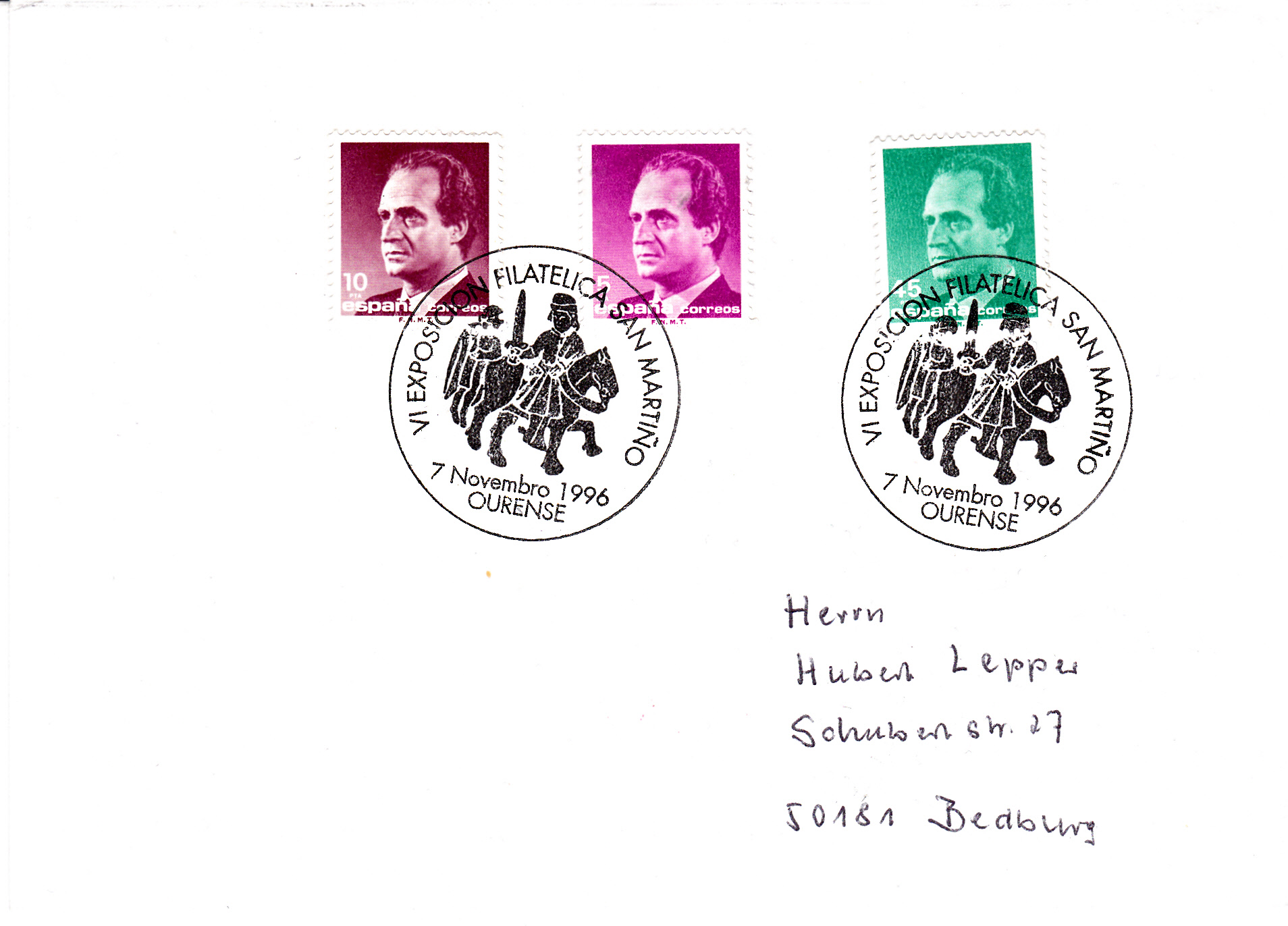 Sonderstempel aus Ourense vom 7.11.1996 zu einer Briefmarkenausstellung mit St.Martin im Stempelbild.