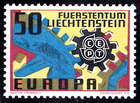 In Liechtenstein erschien eine Europamarken 1967 am 20. April 1967. Hier diese Marke zu 50 Rappen mit dem Gemeinschaftsmotiv "Ineinandergreifende Zahnräder, Antriebsrad mit CEPT-Emblem", die in einer Auflage von 2 234 180 Stück erschien.