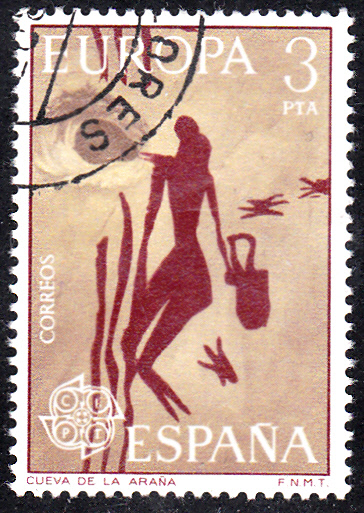 Die Europamarken 1975 zum Gemeinschaftsthema "Gemälde" erschienen in Spanien am 28. April 1975. Hier die Marke zu 3 Pta mit der "Frau bei Honiggewinnung", einer Höhlenmalerei aus La Araña. Die Auflage betrug 20 000 000 Stück.