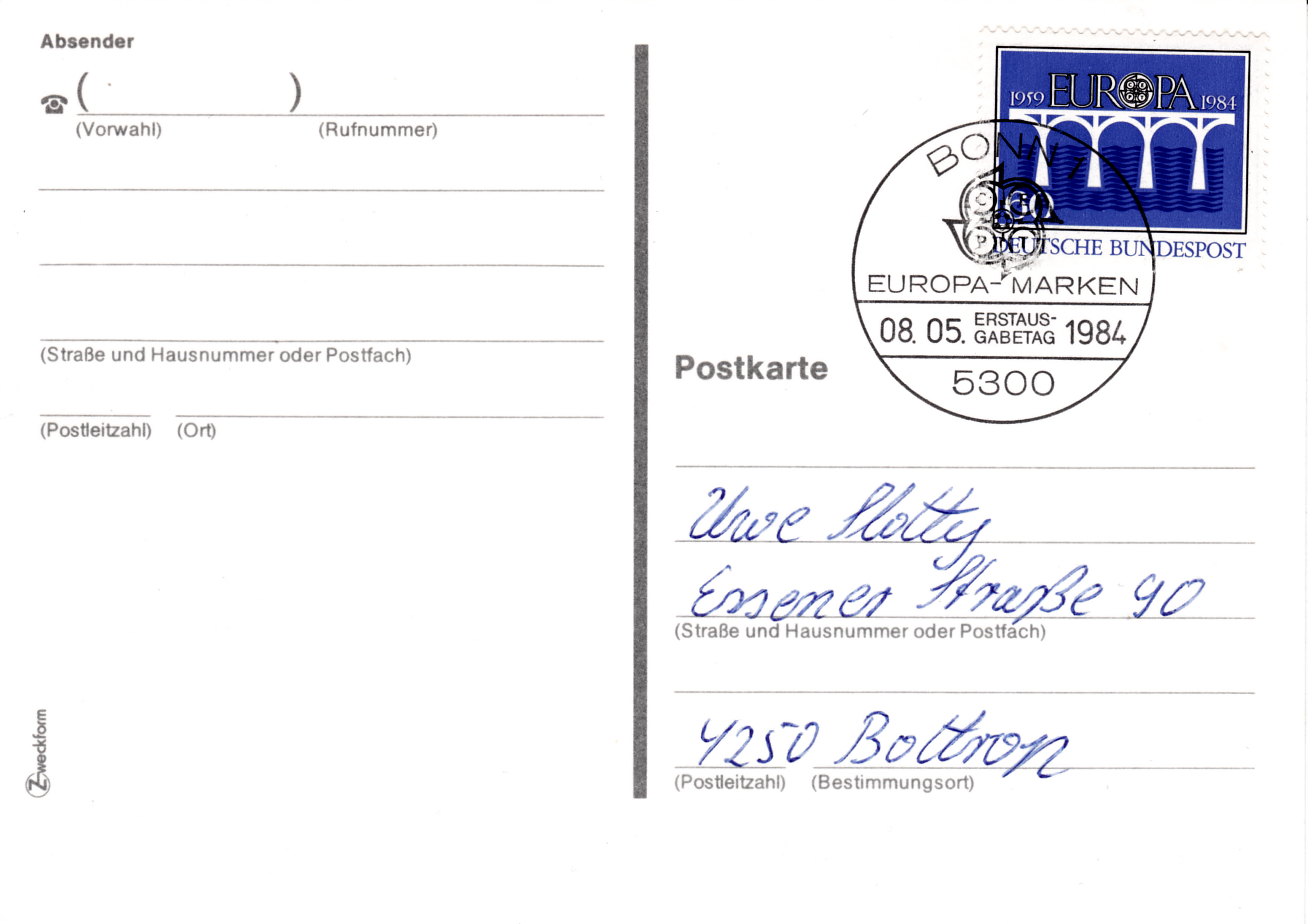 EF der Europamarke 1984 der Wertstufe zu 60 Pfennig am 17.06.1984 portogerecht auf Postkarte: