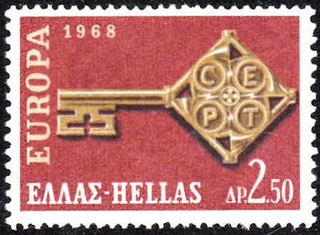 In Griechenland erschienen die Europamarken 1968 am 29. März 1968. Hier eine postfrische Marke zu 2,50 Drachmen mit dem Gemeinschaftsmotiv "Kreuzbartschlüssel mit CEPT-Emblem", die in einer Auflage von 4 155 099 Stück erschien.