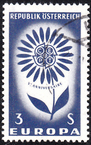 In Österreich erschien eine Europamarke 1964 am 14. September 1964 im Gemeinschaftsmotiv "Stilisierte Blume mit 22 Blütenblättern um CEPT-Emblem". Hier die Marke zu 3 Schilling dunkellilaultramarin. Die Auflage der Marke betrug 3 500 000 Stück.
