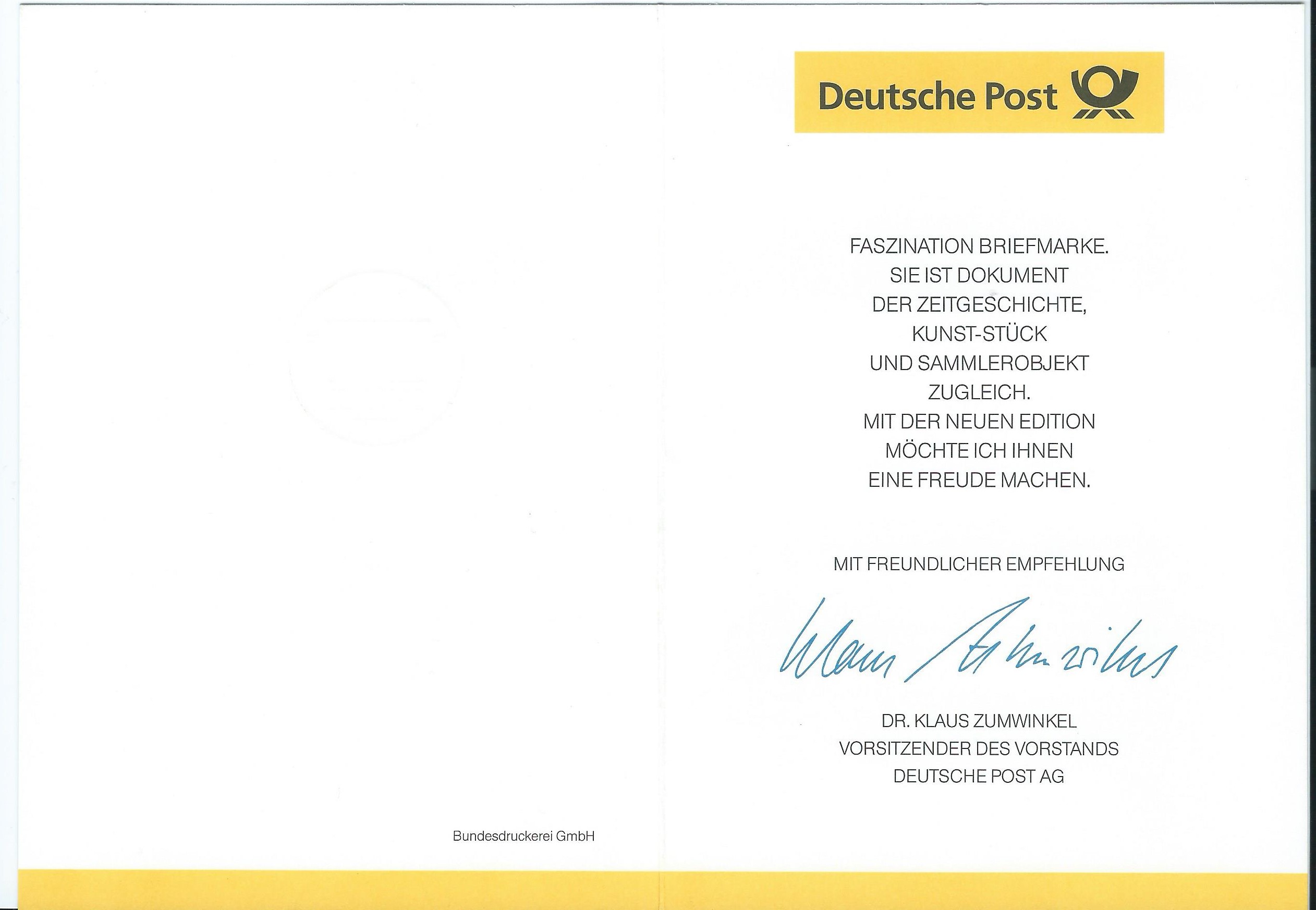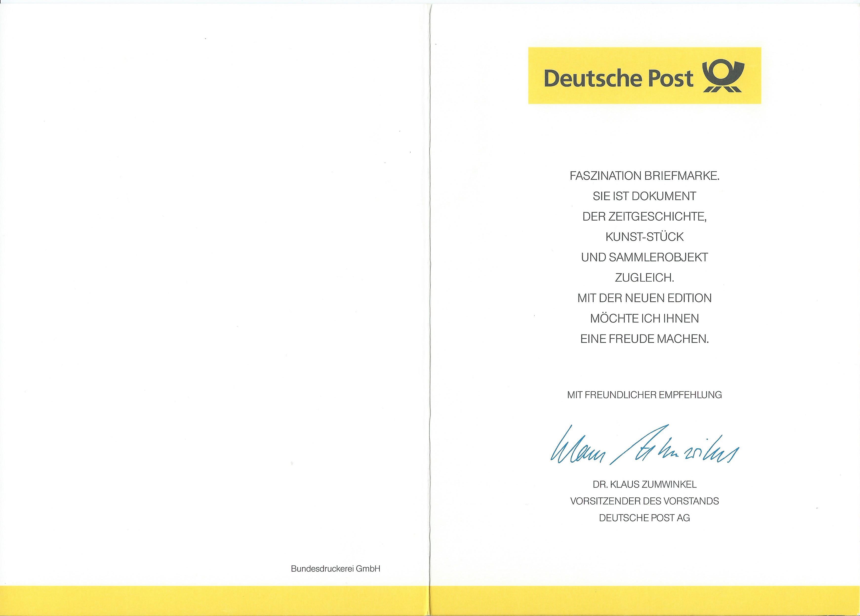 nachdem die Post "privatisiert" wurde und für die Ausgabe von Briefmarken das Finanzministerium zuständig ist, muss man unterscheiden zwischen Ministerkarten und den Klappkarten des Vorsitzenden des Vorstandes der Deutschen Post AG.