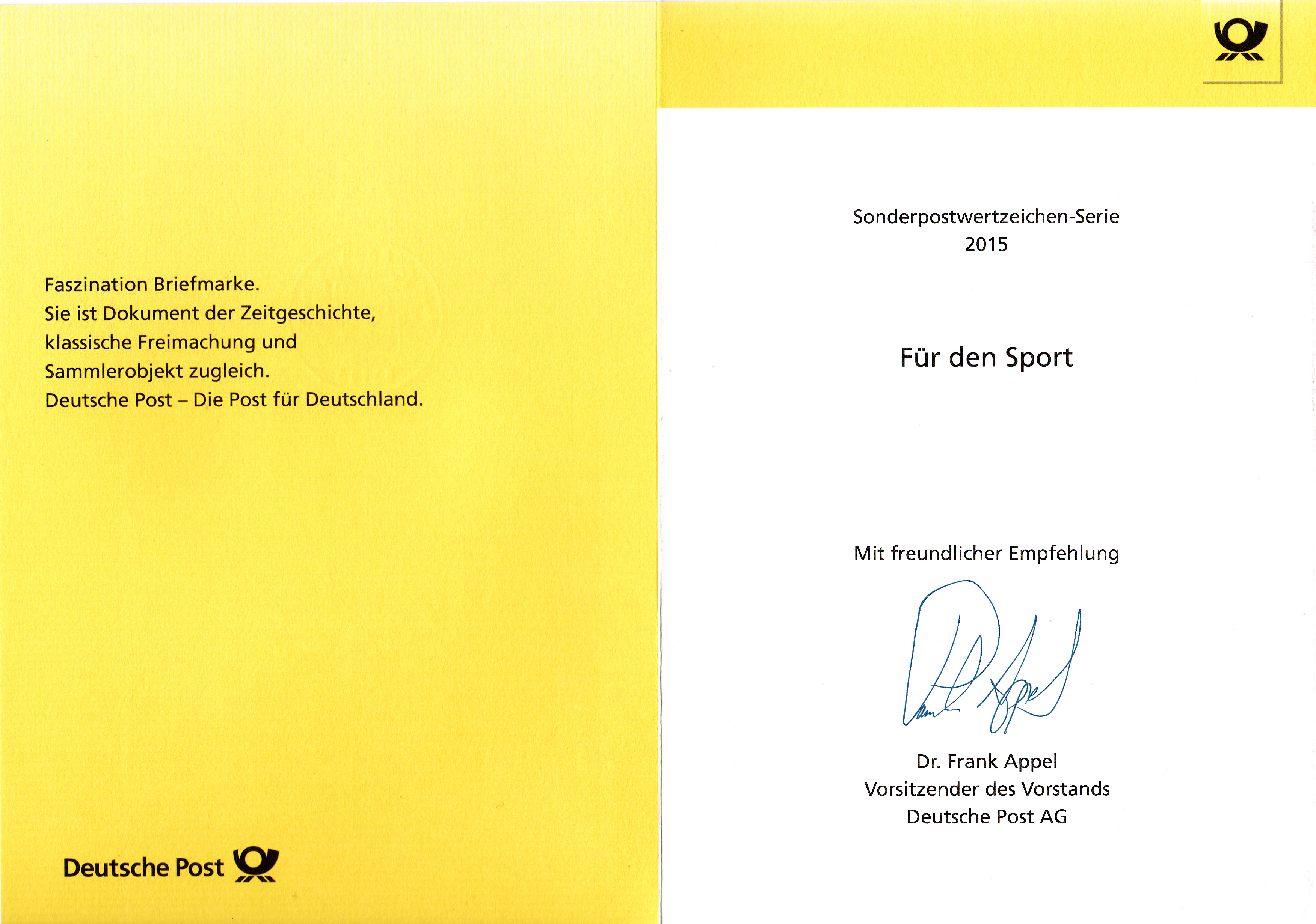 Zu den Marken "Für den Sport" 2015 hier auch die Klappkarte des Vorsitzenden des Vorstands der Deutschen Post AG mit dem Ersttagsonderstempel aus Bonn: