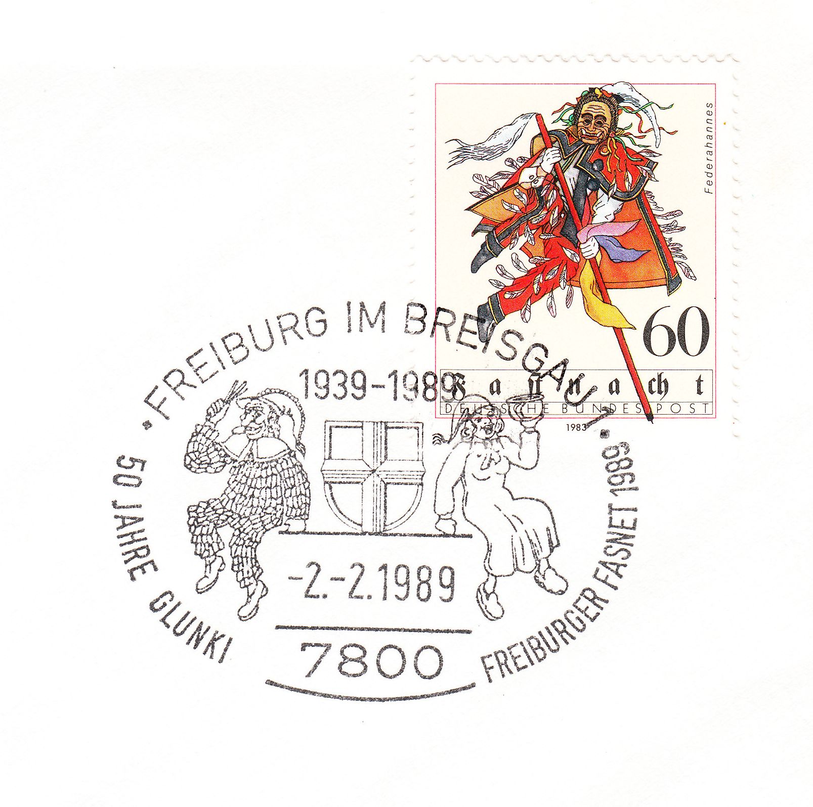 Zum 50-jährigen Jubiläum der Breisgauer Narrenzunft "GLUNKI" = Kasper wurde am 02.02.1989 in Freiburg im Breisgau dieser Sonderstempel eingesetzt: