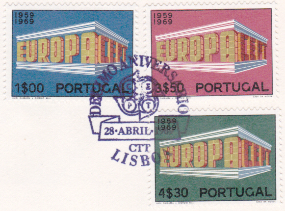 In Portugal sind die Europamarken 1969 am 28. April 1969 mit dem Gemeinschaftsmotiv "„EUROPA“ und „CEPT“ in Tempelform" erschienen. Hier der Wert zu 1,00 Escudo, der in einer Auflage von 9 000 000 Stück erschien.