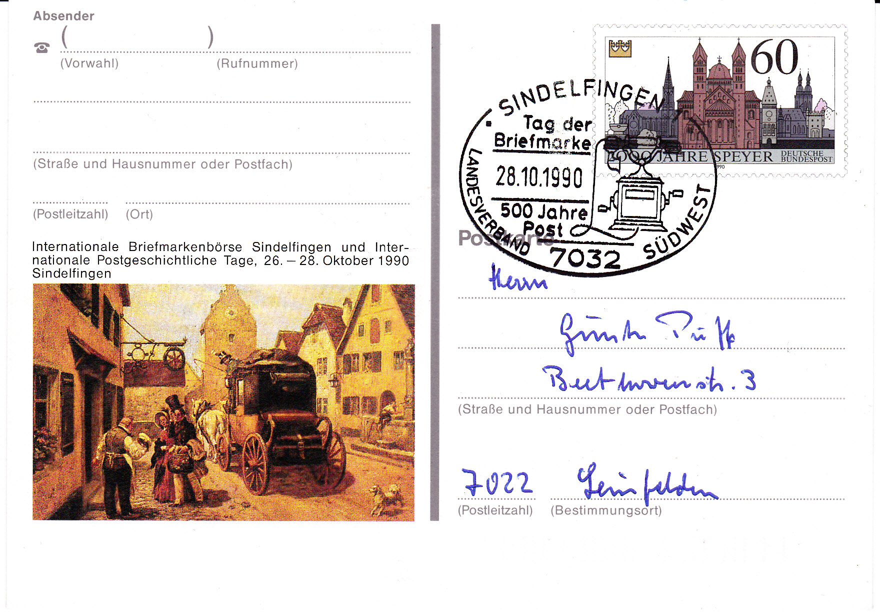 Bei der Internationalen Briefmarkenbörse in Sindelfingen gab es zum Tag der Briefmarke 1990 am 28.10.1990 einen Sonderstempel. Dieser ist hier auf der Sonderpostkarte zur Börse abgeschlagen.