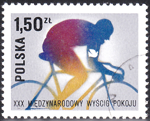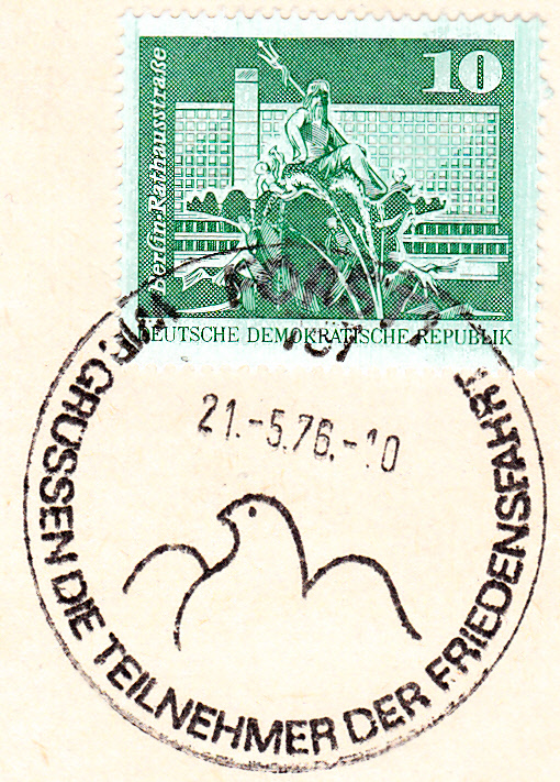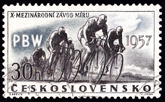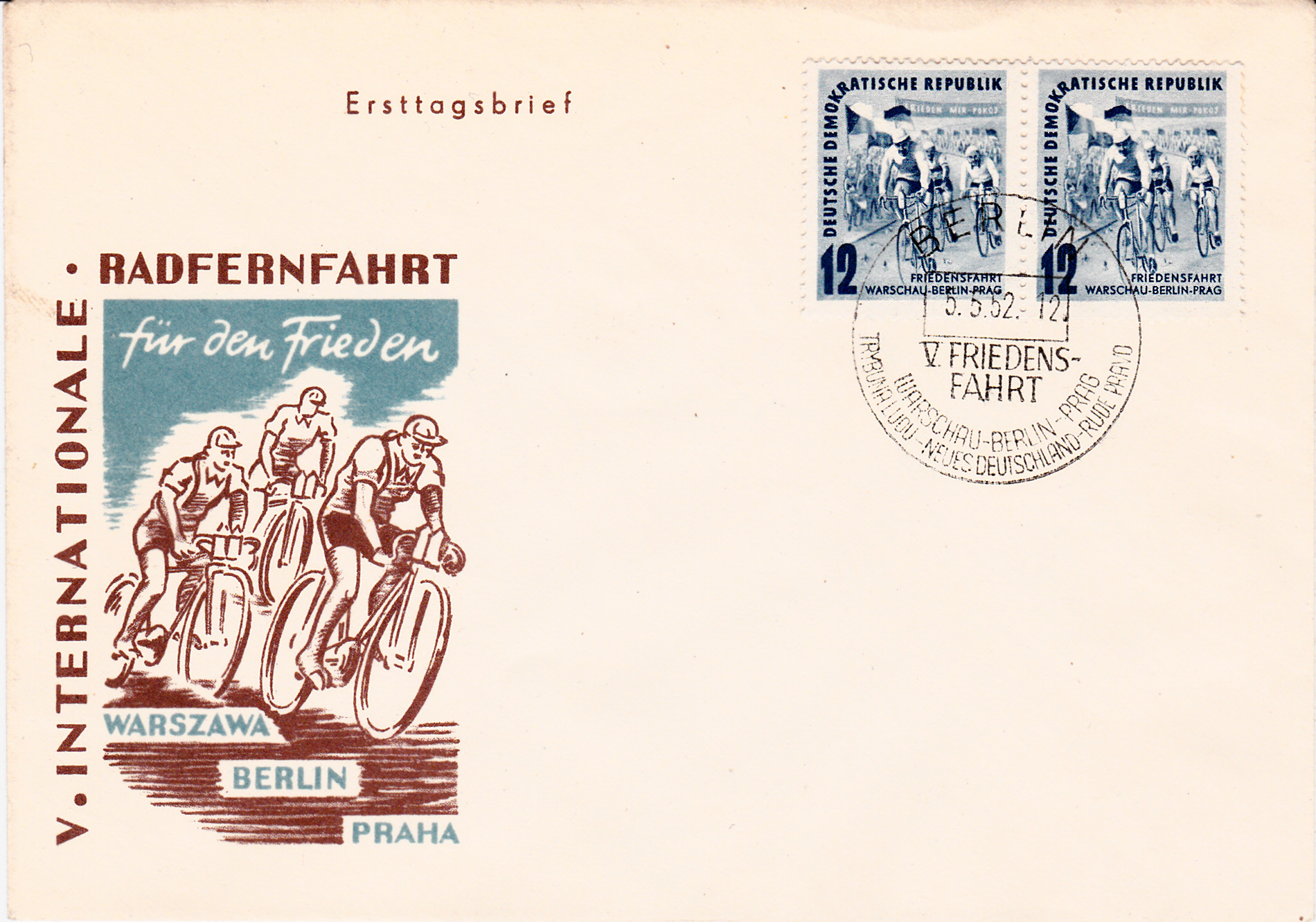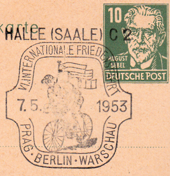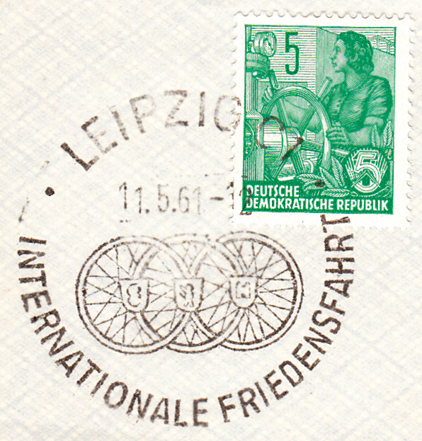 Sonderstempel vom 11.5.1961 aus Leipzig zur internationalen Friedensfahrt Warschau–Berlin–Prag. Leipzig war Zielort der achten Etappe und Startort der neunten Etappe. Im Stempelbild sehen wir drei Speichenräder mit den Wappen von Warschau, Berlin und Prag.