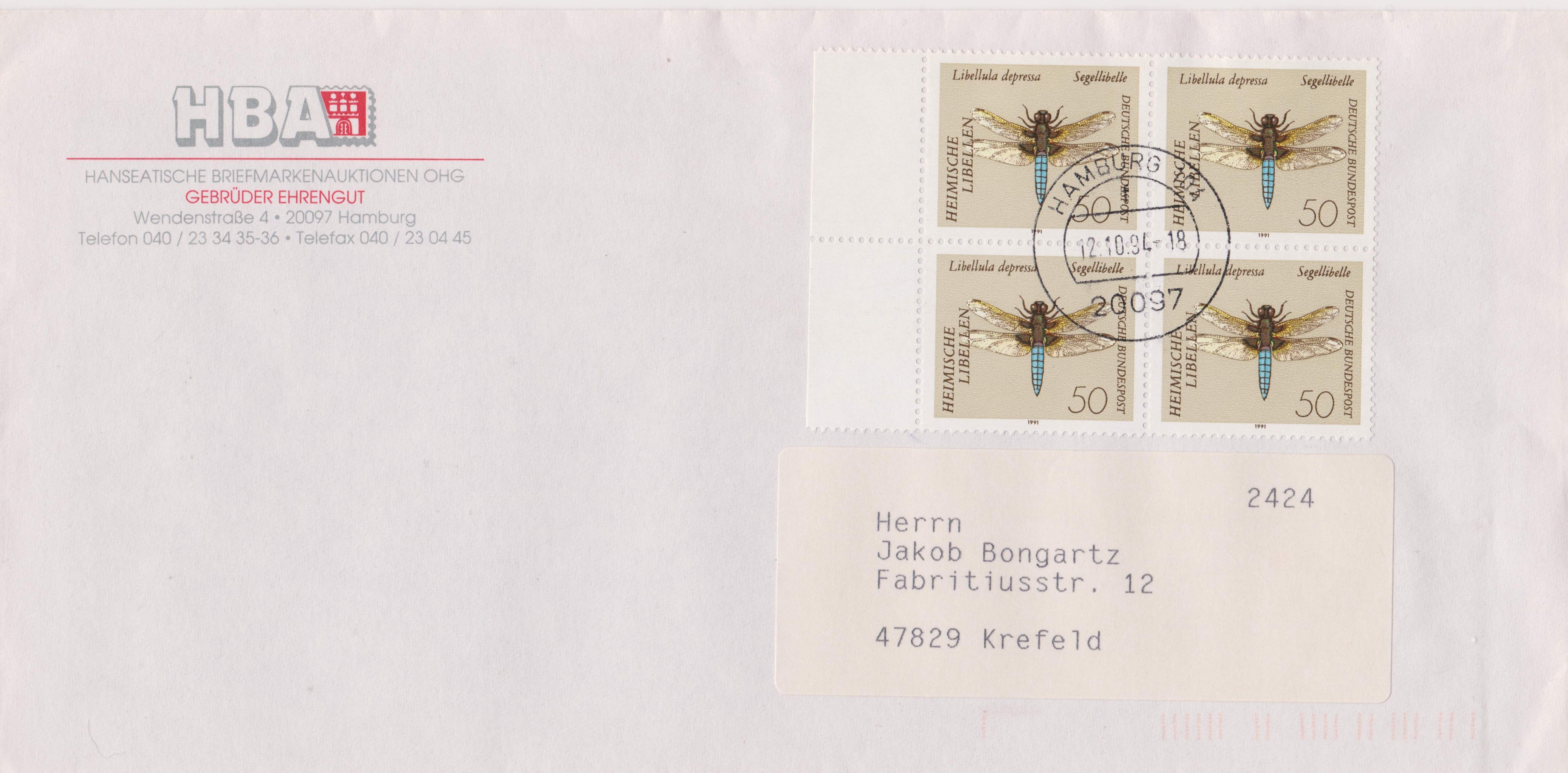 Hier ein solcher Viererblock am 15.07.1991 in Mischfrankatur portorichtig auf einem Standardbrief (100 Pf) per Einschreiben (250 Pf) vom VGO ins VGW: